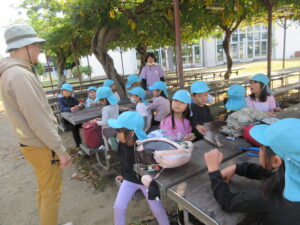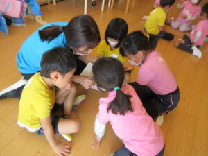 年中ひつじ組を招待しての野外活動です。各グループごとに何を作るのか話し合っているところです。