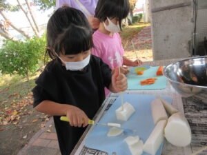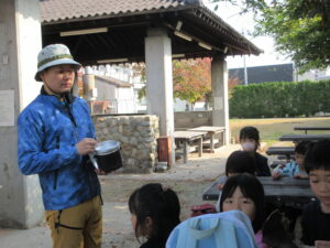 まずは園長先生から飯ごうの説明や包丁ってどっち向きが切れるの?どこ持つの?の話から。