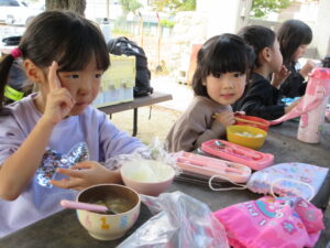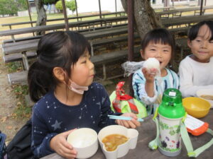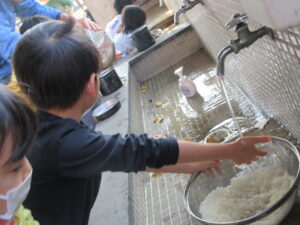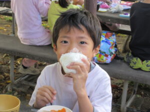 飯ごうで炊いたご飯も美味しそうに炊き上がりました。今回はばらご飯のままたべるのかおにぎりにするのか、自分で決めて食べるスタイルでした。