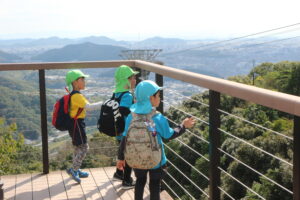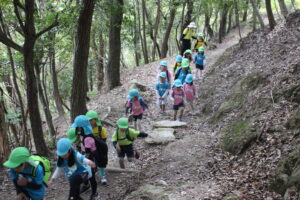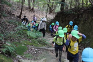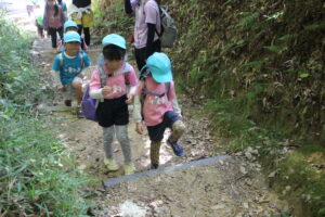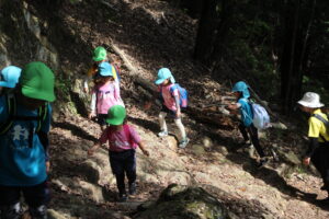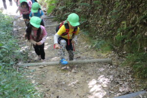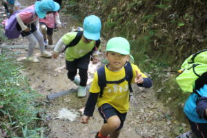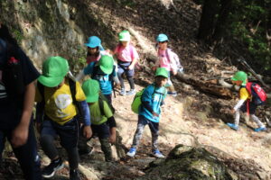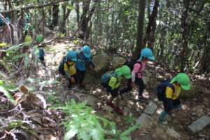 平坦な道、段差が大きい所、でこぼこな岩場、色んな道があり、子どもたち自身がどの道を通っていくのか選択しながら登りました。