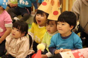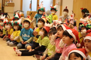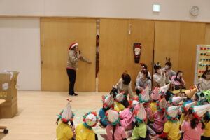 トナカイさんのトークが楽しくて面白くて子ども達は聞き入っています☆(保育士サイドもトナカイトークは楽しみなのだ!)